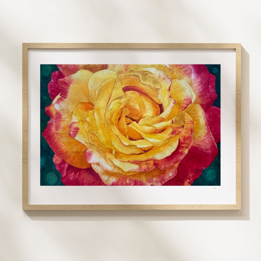 With this painting, I wanted to express warmth and tenderness through the rich colors of a yellow and red rose.