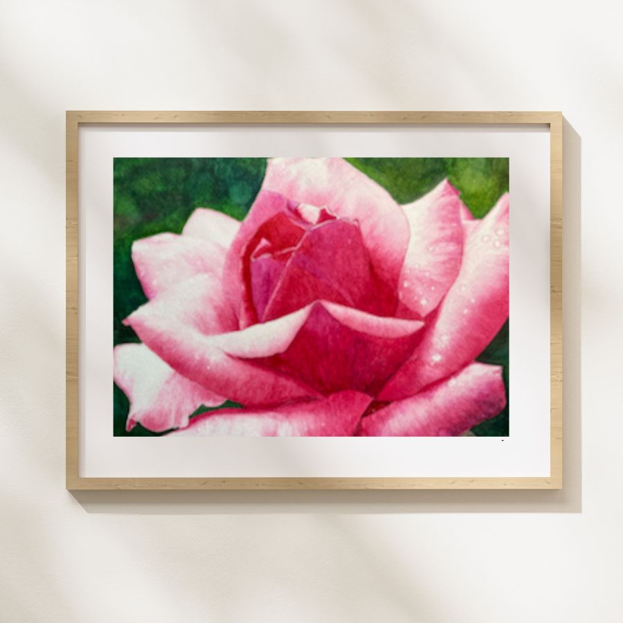 This vibrant pink rose was painted with soft, transparent layers of watercolor to capture the way light moves across its petals.